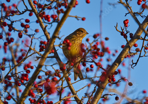 Yellowhammer on a hawthorn bush