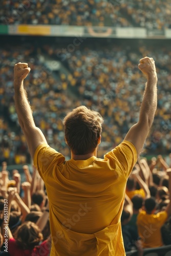 Yellow-shirted man celebrates in a busy stadium filled with cheering fans, his arms raised high. The atmosphere is electric as the crowd watches the sports event unfold.