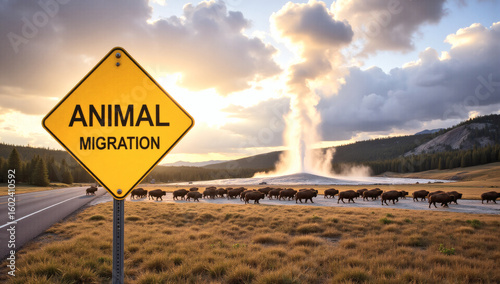 Yellowstone Bison Migration with Caution Sign, Dramatic Wildlife, Animal Crossing, Conservation, Travel, National Park, Nature Photography, Editorial Use, Cinematic Landscape, Golden Hour Lighting, Ye