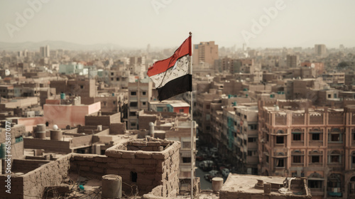 Yemeni flag at the top of a building overlooking the city, made with generative AI