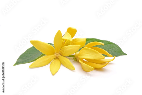 Ylang-Ylang (Cananga odorata) valued for perfume extracted from its flowers, which is an essential oil used in aromatherapy. Also called fragrant cananga, Macassar-oil, or perfume tree. Isolated.