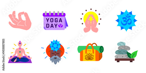 Yoga and meditation icon set. Collection of spiritual colorful elements like asanas, chakras, om symbol, guru and yoga accessories. Mindfulness and balance symbol. Harmony sign. Inner peace pictogram.