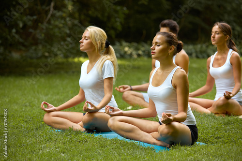 Yoga Class. Group of People Meditating At Summer Park