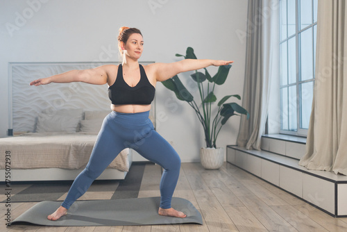 Yoga fitness workout training. Woman practicing yoga at home. Plus size female doing sports exercise on yoga mat indoor. Girl in sportswear have training workout for weight loss. Sport and fitness