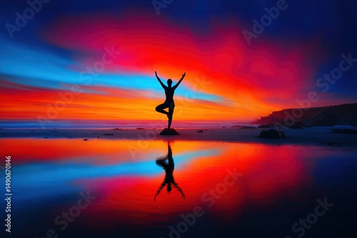 Yoga meditation on beach vibrant sunset