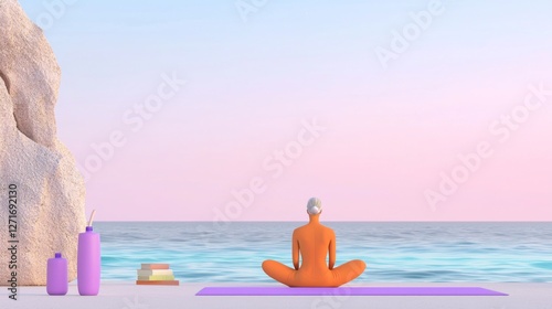 yoga mindfulness discipline. A serene individual practices yoga on a beach at sunset, surrounded by calming colors and natural elements.