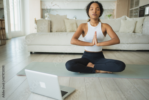 Yoga mindfulness meditation online. African woman practicing yoga with online lessons in laptop at home. Woman sitting in lotus pose meditating relaxing. Girl doing breathing practice. Yoga at home