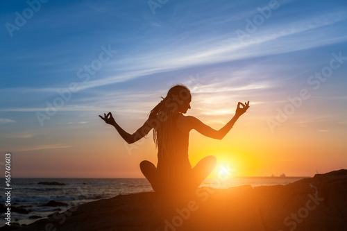 Yoga silhouette. Meditation woman on the ocean during amazing sunset.