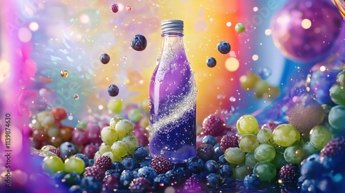 Yogurt bottle with silver mist and spinning blueberries and grapes