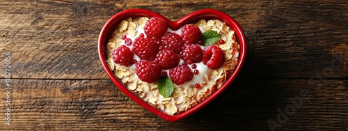 Yogurt breakfast oat bowl cereal fruit granola muesli healthy oatmeal. Strawberry yogurt milk oat breakfast porridge berry food honey background red yoghurt meal overnight top white jar fresh view.