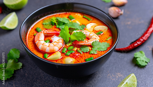 Yom yum kung spicy Thai soup with shrimp in a black bowl. Thailand food. Taste of heritage