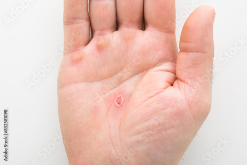 Young adult man palm with red callus after work on light gray table background. Closeup. Top down view.