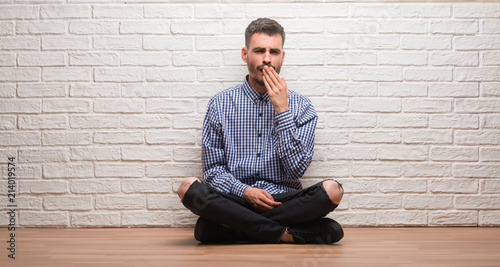 Young adult man sitting over white brick wall bored yawning tired covering mouth with hand. Restless and sleepiness.