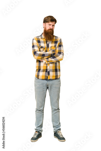Young adult redhead man with a long beard standing full body isolated suspicious, uncertain, examining you.