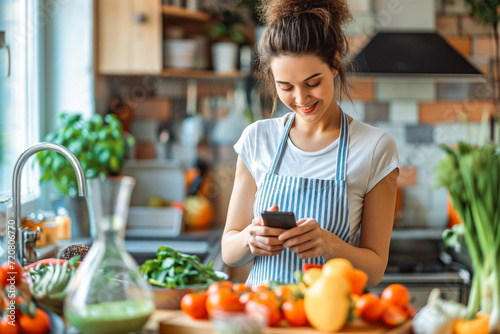 Young adult woman Cooking for Healthier Living, looking for recipes on mobile phone.She likes healthy food. She cooks for the family who comes for family lunch.