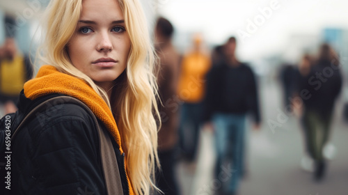 young adult woman or teenager girl, student, blonde long hair, school bag or backpack, autumn jacket, sad or overtired, tired and unhappy