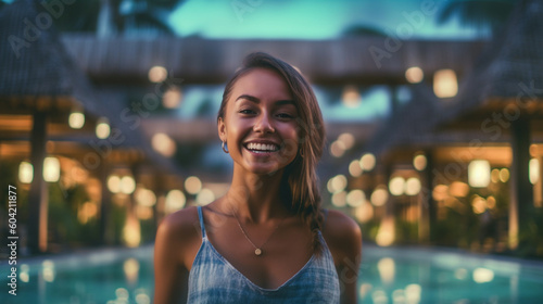 young adult woman vacation at tropical swimming pool of the hotel in the evening. Generative AI