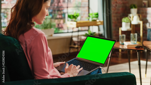 Young Adult Woman Working from Home Loft Apartment on Laptop Computer with Green Screen Mock Up Display. Creative Female Using Trackpad and Browsing Internet. Close Up Over the Shoulder Photo.