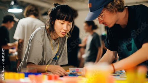 Young Adults Working Together on Creative Project at Table in Studio, Illustrating Collaboration and Teamwork in a Modern Workspace for Business and Education : Generative AI
