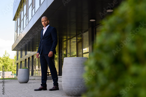 Young african american businessman in suit looking at camera near building on urban street