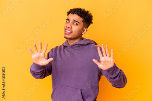 Young african american curly man isolated on purple rejecting someone showing a gesture of disgust.