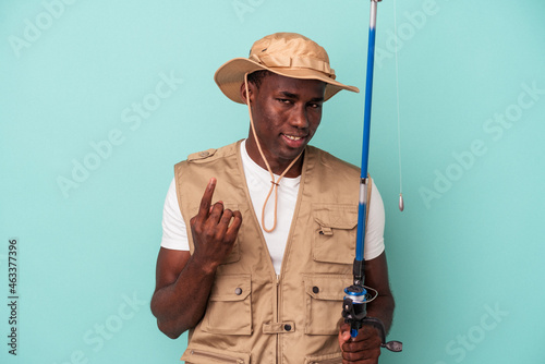 Young African American fisherman holding rod isolated on blue background pointing with finger at you as if inviting come closer.
