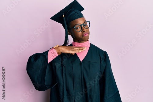 Young african american girl wearing graduation cap and ceremony robe cutting throat with hand as knife, threaten aggression with furious violence