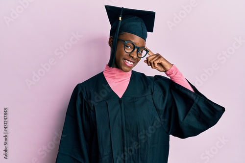 Young african american girl wearing graduation cap and ceremony robe smiling pointing to head with one finger, great idea or thought, good memory