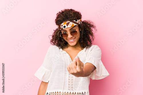 Young african american hipster woman isolated on pink background pointing with finger at you as if inviting come closer.