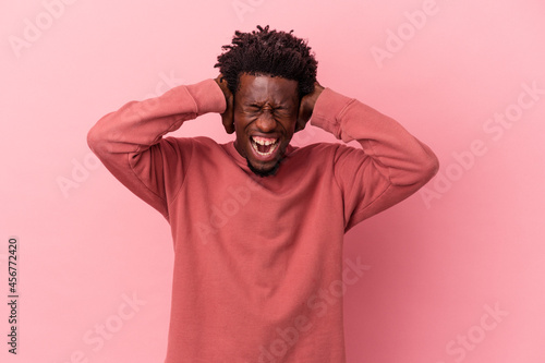 Young african american man isolated on pink background covering ears with hands trying not to hear too loud sound.