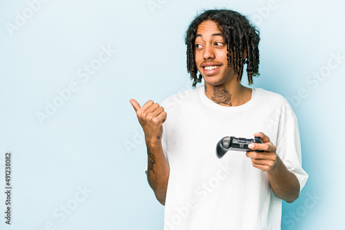 Young African American man playing with a video game controller isolated on blue background points with thumb finger away, laughing and carefree.