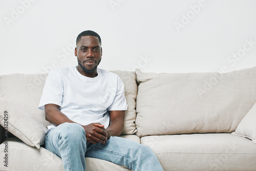 Young African American man sitting on a beige sofa, wearing a white t shirt and blue jeans, displaying a friendly expression in a minimalist living room