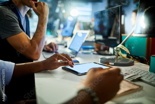 Young African American man using a tablet in a modern business office