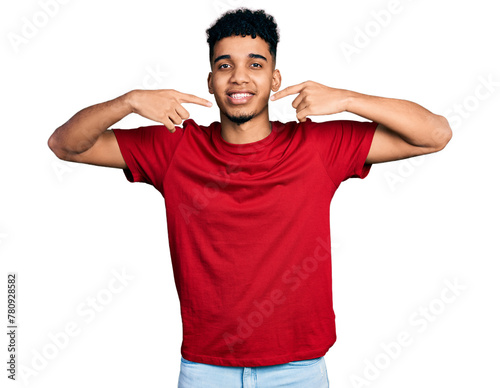 Young african american man wearing casual red t shirt smiling cheerful showing and pointing with fingers teeth and mouth. dental health concept.