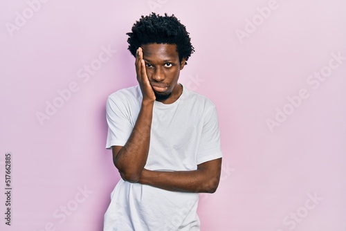 Young african american man wearing casual white t shirt thinking looking tired and bored with depression problems with crossed arms.