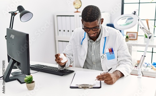 Young african american man wearing doctor uniform holding pills at clinic