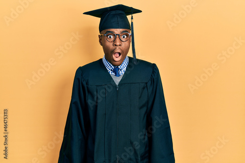 Young african american man wearing graduation cap and ceremony robe afraid and shocked with surprise and amazed expression, fear and excited face.