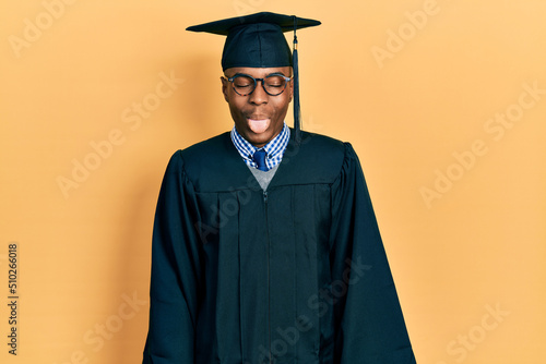 Young african american man wearing graduation cap and ceremony robe sticking tongue out happy with funny expression. emotion concept.