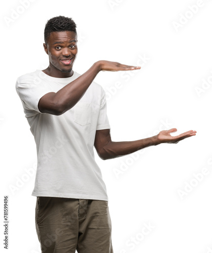 Young african american man wearing white t-shirt gesturing with hands showing big and large size sign, measure symbol. Smiling looking at the camera. Measuring concept.