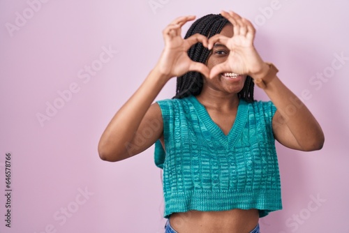 Young african american with braids standing over pink background doing heart shape with hand and fingers smiling looking through sign