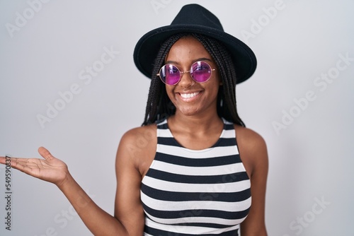 Young african american with braids wearing hat and sunglasses smiling cheerful presenting and pointing with palm of hand looking at the camera.