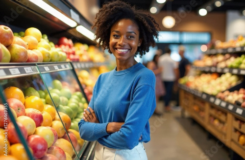 Young African American woman in a supermarket choosing a product. Shopping concept.