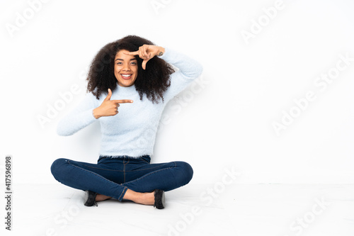 Young african american woman sitting on the floor focusing face. Framing symbol