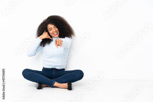 Young african american woman sitting on the floor making phone gesture and pointing front