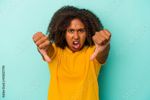Young african american woman with curly hair isolated on blue background showing thumb down and expressing dislike.