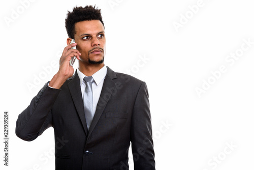 Young African businessman talking on mobile phone while thinking