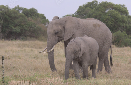 young african elephant standing with mother and grazing peacefully in the wild plains of the masai mara, kenya