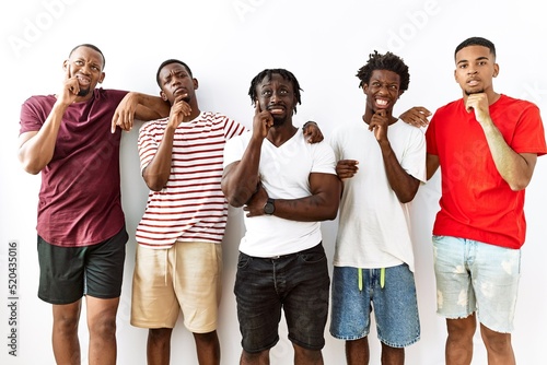 Young african group of friends standing together over isolated background thinking worried about a question, concerned and nervous with hand on chin