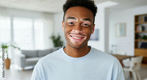 Young african male adult with vitiligo smiling in modern living room.