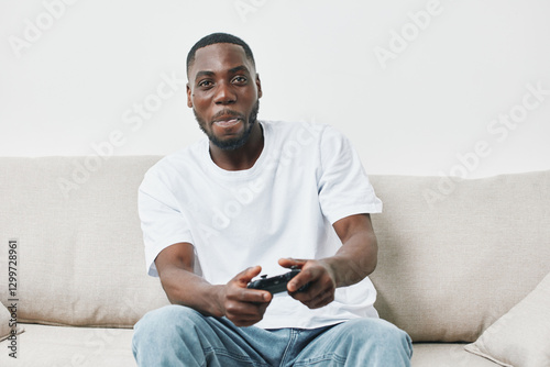Young African man enjoying video games on a couch, wearing a casual white t shirt and smiling with excitement, showcasing a relaxed and enjoyable atmosphere